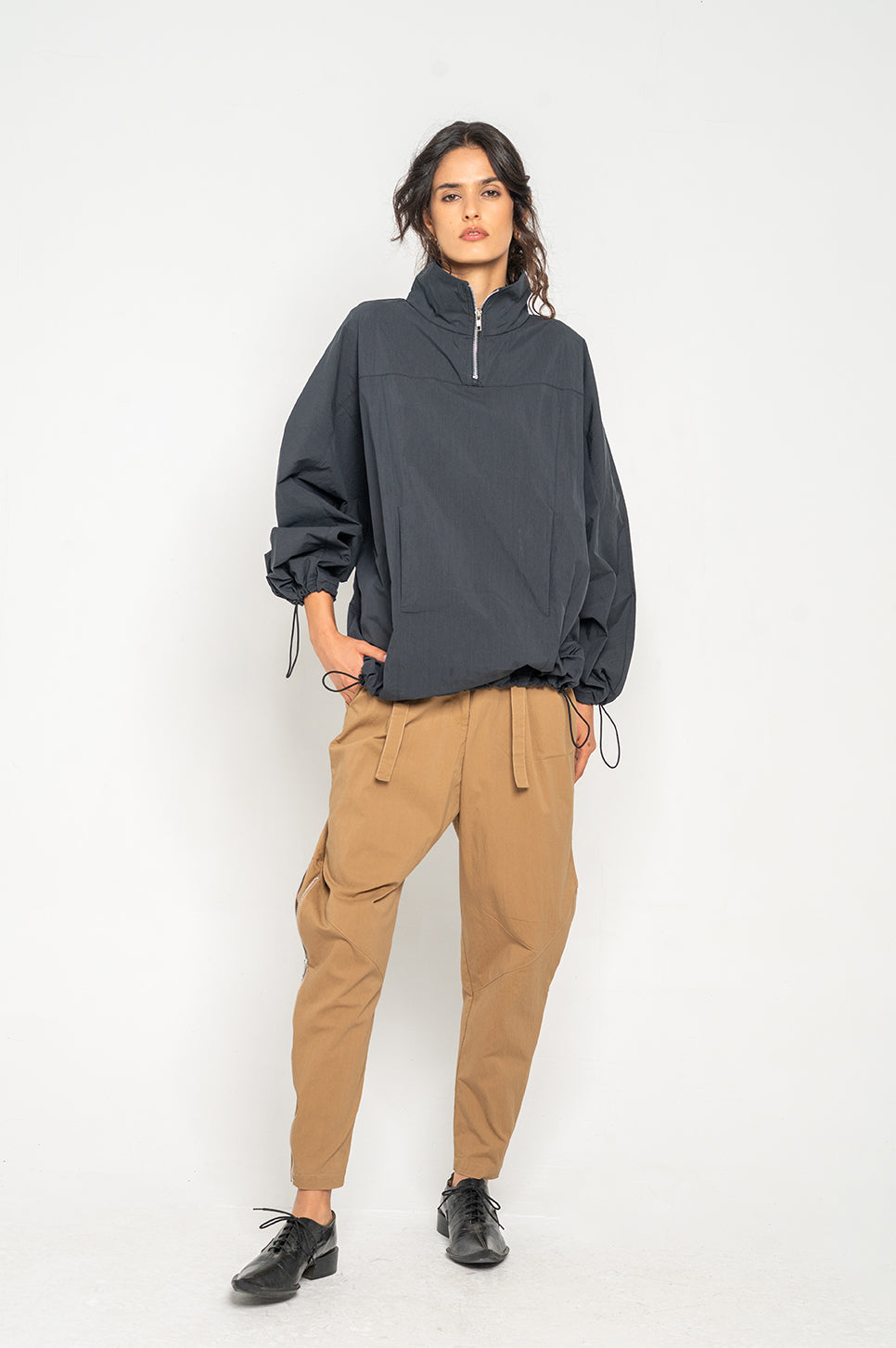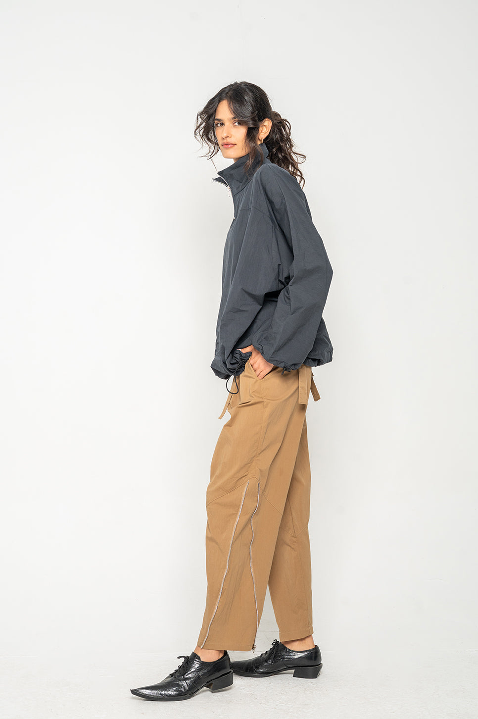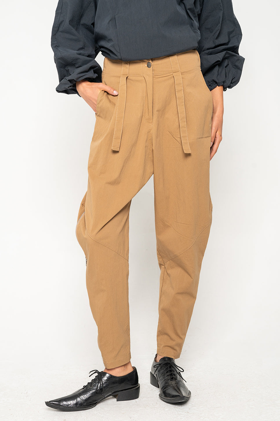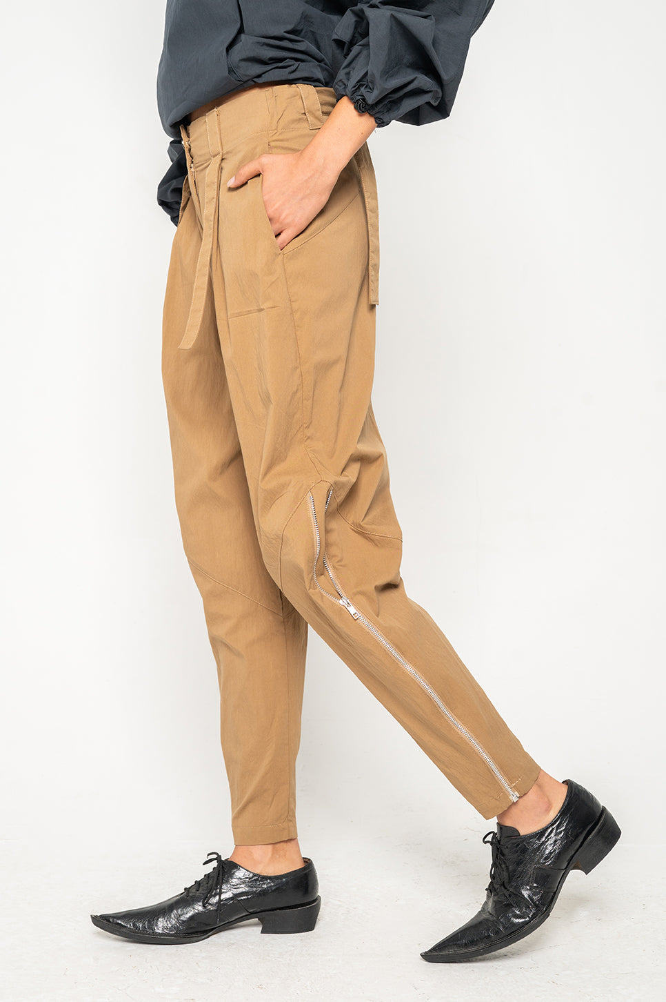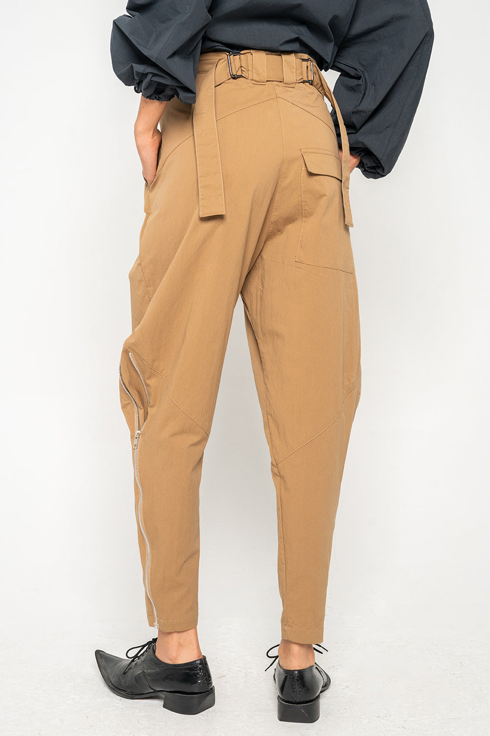 המכנסיים הכי מעניינים שיהיו לך בארון! מכנסיים במראה משוחרר, עם רצועות הידוק מותן מאחור. הרוכסנים בשוקיים מאפשרים משחק עם הגזרה ומייצרים מראה חדש בכל פעם. עם רכיסה סטנדרטית, שני כיסי צד וכיס אחורי אחד. את הרצועות הקצרות מלפנים ניתן לקשור או להשאיר משוחררות.- אבישג: גובה 176 ס"מ | היקפים: חזה 76 ס"מ | מותן 62 ס"מ | אגן 86 ס"מ, לובשת מידה 0.