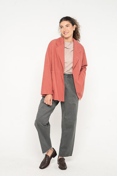 ג'קט אוברסייז פתוח בגזרה ישרה מבד אריג דק. בעל צווארון בסגנון מחוייט ושני כיסים קדמיים.