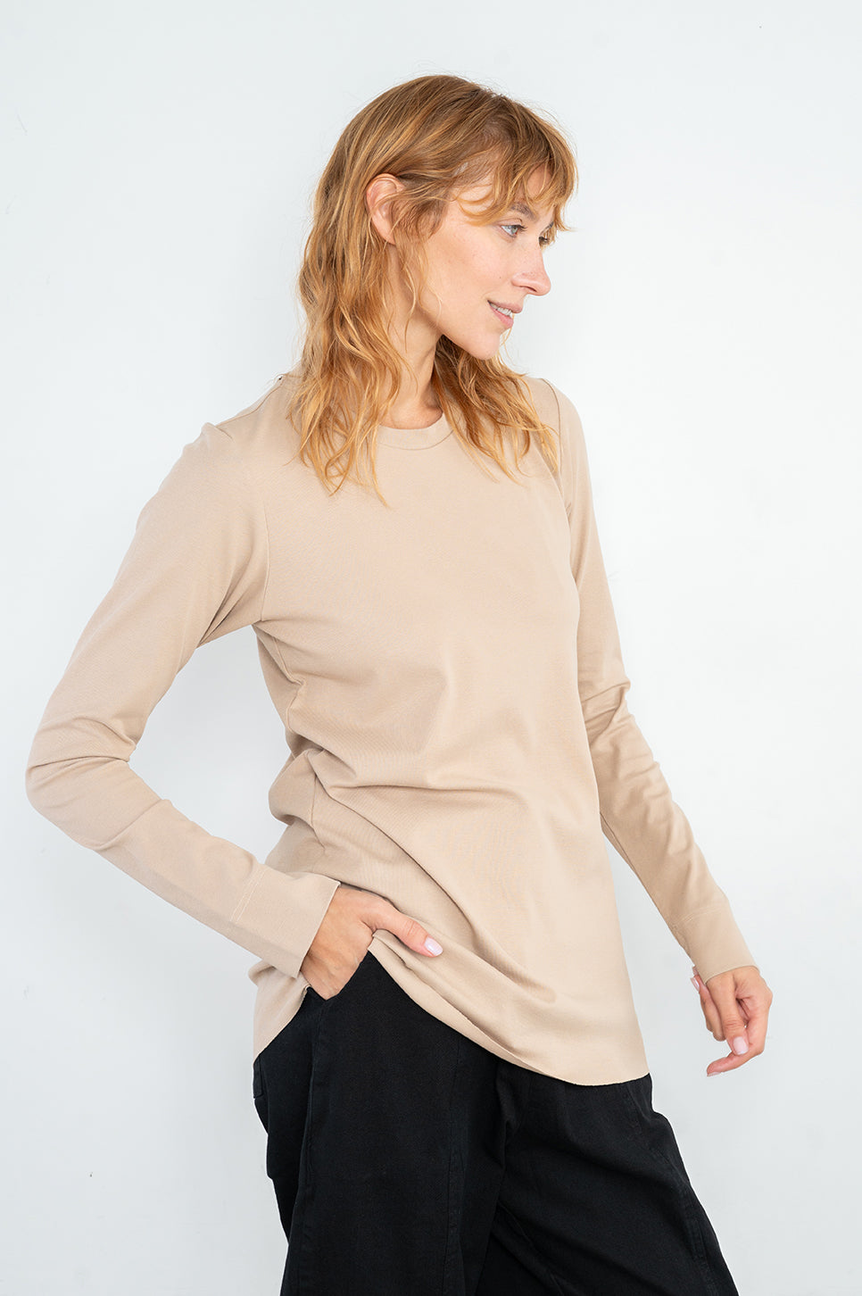 חולצת טריקו בגזרה ישרה וקרובה לגוף עם פתח לאגודל בקצה השרוול. מצויינת גם כשכבה תחתונה בימים קרים במיוחד.- אנה: גובה 178 ס"מ. היקפים: חזה 88 ס"מ | מותן 70 ס"מ | אגן 90 ס"מ, לובשת מידה 2.